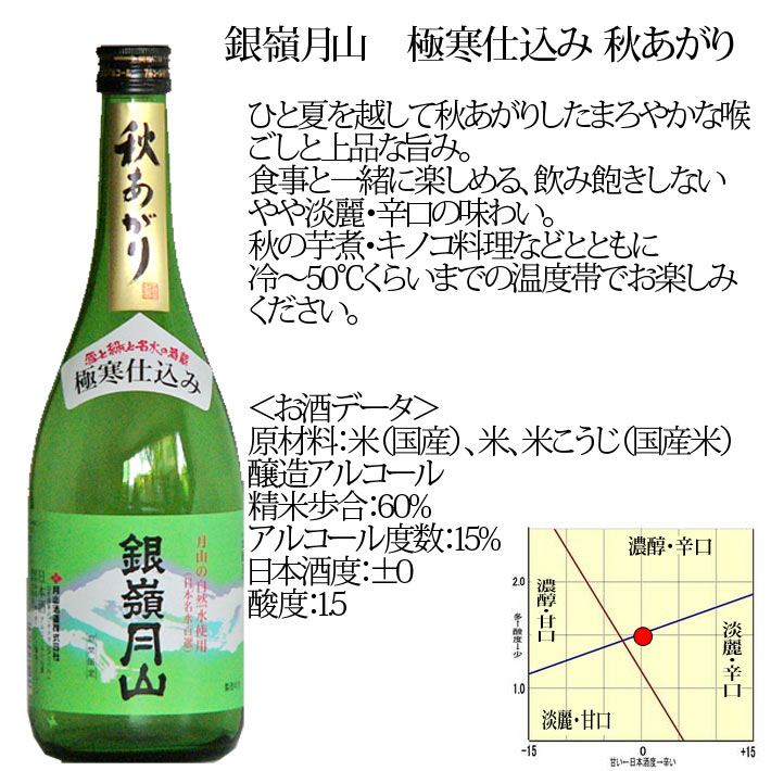| ひと夏を越して秋あがりしたまろやかな喉ごしと上品な旨み。 食事と一緒に楽しめる、飲み飽きしないやや淡麗・辛口の味わい。 秋の芋煮・キノコ料理などとともに冷~50℃くらいまでの温度帯でお楽しみください。 <お酒データ> 原材料:米(国産)、米、米こうじ(国産米) 醸造アルコール 精米歩合:60% アルコール度数:15% 日本酒度:±0 酸度:1.5 商品説明 ■ お酒データ ひと夏を越して秋あがりしたまろやかな喉 ごしと上品な旨み。 食事と一緒に楽しめる、飲み飽きしない やや淡麗・辛口の味わい。 秋の芋煮・キノコ料理などとともに 冷~50℃くらいまでの温度帯でお楽しみ ください。 <お酒データ> 原材料:米(国産)、米、米こうじ(国産米) 醸造アルコール 精米歩合:60% アルコール度数:15% 日本酒度:±0 酸度:1.5 |