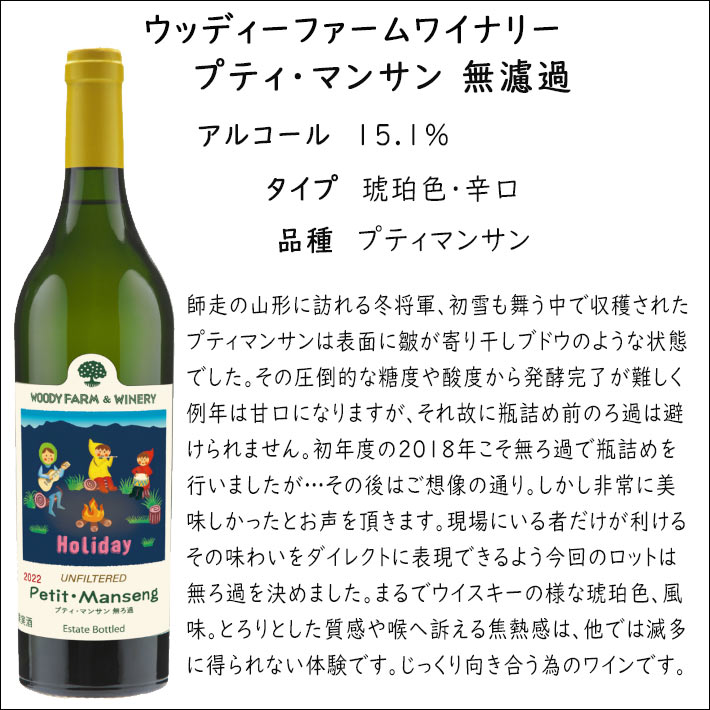 | ブドウの糖度だけで脅威のアルコール15%越えのプティマンサンを敢えて無濾過で瓶詰めした益荒男のような強い味わい 商品詳細 ■ ワイナリーからのコメント 師走の山形に訪れる冬将軍、初雪も舞う中で収穫されたプティマンサンは表面に皺が寄り干しブドウのような状態でした。 その圧倒的な糖度や酸度から発酵完了が難しく例年は甘口になりますが、それ故に瓶詰め前のろ過は避けられません。 初年度の2018年こそ無ろ過で瓶詰めを行いましたが…その後はご想像の通り。しかし非常に美味しかったとお声を頂きます。 現場にいる者だけが利けるその味わいをダイレクトに表現できるよう今回のロットは無ろ過を決めました。 まるでウイスキーの様な琥珀色、風味。 とろりとした質感や喉へ訴える焦熱感は、他では滅多に得られない体験です。 じっくり向き合う為のワインです。 8月の日照不足もありプティマンサンの成熟は例年よりも緩慢でした。 それ以降の天候は回復し、11月中旬には非常に良いプティマンサンが収穫できましたが…、さらに。 さらに完熟を求めて。最終的には12月5、6日に収穫を行っています。 すでに辺りは雪が舞い、白色の世界に濃い黄色のブドウが残る姿を見れる地域は世界でどれ程でしょう。 濃度が凝縮されたブドウを全房でゆっくり搾汁し、新樽を含めて全て樽発酵をしております。 酵母はそれぞれの特性を示しながら、春を迎えます。 いつもなら1年以上かかる発酵も、1樽だけ完全に完了していました。 恐る恐るアルコールを調べると15%を超えているではありませんか。 例年のプティマンサンは残糖がある為、止む無くろ過を行いますが、この原酒であれば無濾過でも再発酵のリスクは少ないだろう。 斯くして生まれた益荒男ワイン。じっくり味わいたい人向けです。 |