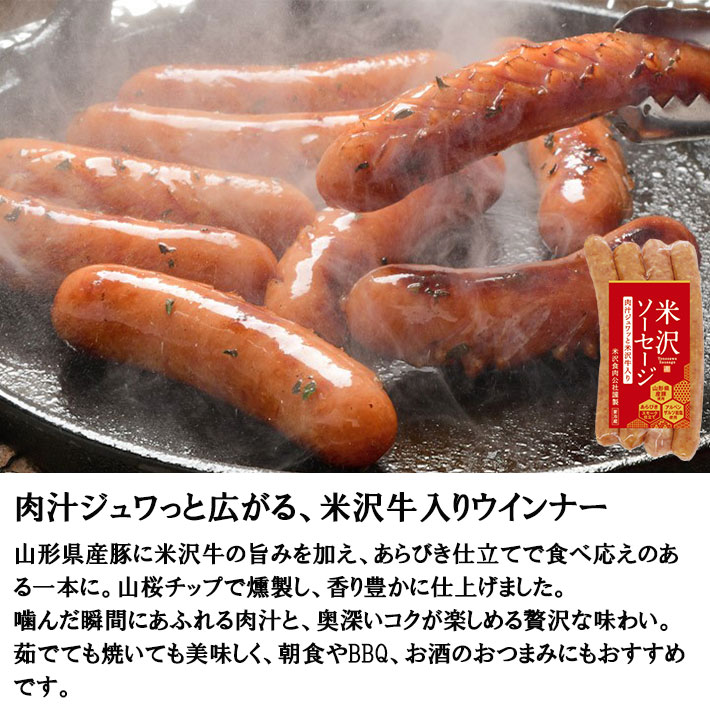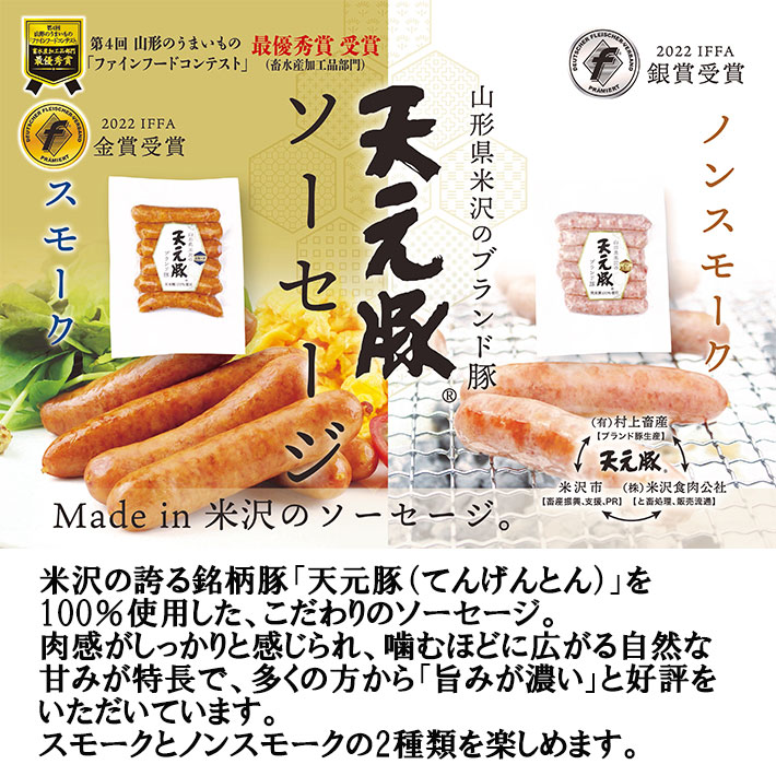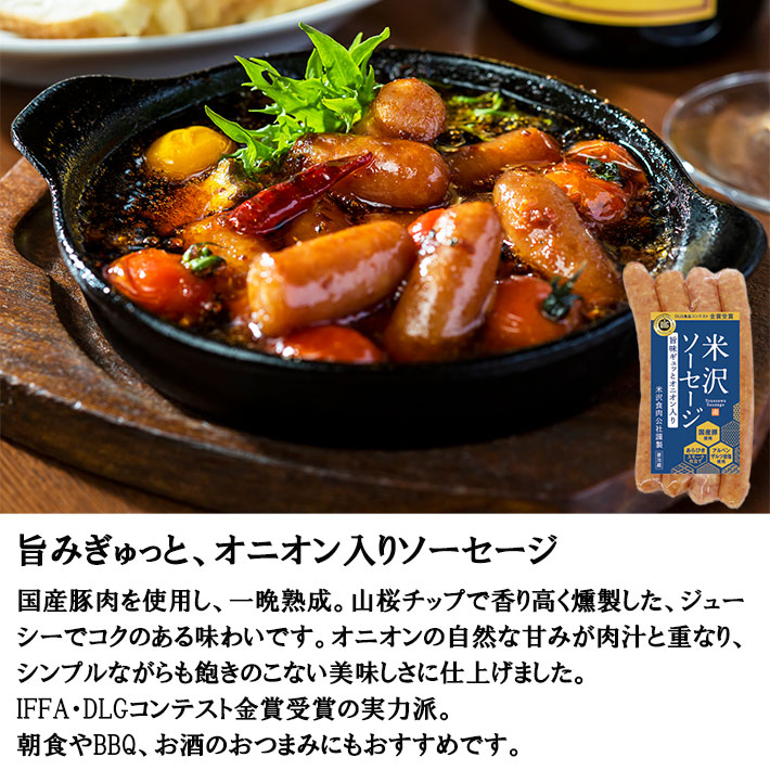 | 大切な人へ、ちょっと贅沢なごちそうを。 商品説明 ■ 商品詳細 2019年に米沢ソーセージ(米沢牛入り)・(オニオン入り)はIFFA(ドイツ食肉協会)の食品コンテストで金賞受賞しました。また、米沢のブランド豚 天元豚 を100%使用したあらびきソーセージはボイル用にスモーク、グリル用のノンスモークを詰合せに。米沢牛を100%使用した米沢燻しスモーク・ペッパーはワインと一緒にお召し上がりください。 ■ セット内容 ・天元豚ソーセージ スモーク 120g×1 ・天元豚ソーセージ ノンスモーク 120g×1 ・米沢ソーセージ オニオン入り 120g×1 ・米沢ソーセージ 米沢牛入り 120g×1 ・米沢牛燻しスモーク 60g×1 ・米沢牛燻しスモークペッパー 60g×1 ■ 原材料名 <天元豚ソーセージ スモーク> 豚肉【天元豚(山形県産)】、豚脂肪、食塩、糖類(ぶどう糖、水飴)、香辛料/リン酸塩(Na、K)、調味料(アミノ酸等)、酸化防止剤(ビタミンC)、保存料(ソルビン酸)、発色剤(亜硝酸Na)、香辛料抽出物、くん液、(一部に豚肉を含む) <天元豚ソーセージ ノンスモーク> 豚肉【天元豚(山形県産)】、豚脂肪、食塩、糖類(ぶどう糖、水飴)、香辛料/リン酸塩(Na、K)、調味料(アミノ酸等)、酸化防止剤(ビタミンC)、保存料(ソルビン酸)、発色剤(亜硝酸Na)、香辛料抽出物、くん液、(一部に豚肉を含む) <米沢ソーセージ オニオン入り> 豚肉(国産)、豚脂肪(国産)、でん粉、食塩(アルペンザルツ岩塩)、糖類(ぶどう糖、水飴)、玉ねぎ、香辛料/リン酸塩(Na、K)、調味料(アミノ酸等)、酸化防止剤(ビタミンC)、保存料(ソルビン酸)、発色剤(亜硝酸Na)、香辛料抽出物、くん液、(一部に豚肉を含む) <米沢ソーセージ 米沢牛入り> 畜肉【豚肉(山形県産)、牛肉(米沢牛)】、豚脂肪(国産)、でん粉、食塩(アルペンザルツ岩塩)、糖類(ぶどう糖、水飴)、香辛料、玉ねぎエキス/リン酸塩(Na、K)、調味料(アミノ酸等)、酸化防止剤(ビタミンC)、保存料(ソルビン酸)、発色剤(亜硝酸Na)、香辛料抽出物、くん液、(一部に豚肉・牛肉を含む) <米沢牛燻しスモーク> 牛肉【米沢牛(山形県産)】、食塩、糖類(砂糖、水飴)/調味料(アミノ酸)、酸化防止剤(ビタミンC)、発色剤(亜硝酸Na)、(一部に牛肉を含む) <米沢牛燻しスモークペッパー> 牛肉【米沢牛(山形県産)】、香辛料、ごま、食塩、糖類(砂糖、水飴)/調味料(アミノ酸)、酸化防止剤(ビタミンC)、発色剤(亜硝酸Na)、(一部に牛肉・ごまを含む) ■ 賞味期限 製造日含む30日間 ■ 保存方法 10℃以下で保存してください。 ■ 製造者 株式会社米沢食肉公社 〒992-1125 山形県米沢市万世町片子5379-15 ■ アレルギー表示 乳成分、牛肉、豚肉、 本工場では小麦・乳成分・卵・落花生を含む製品を製造しています。 ■ 発送方法 クール便 生産者直送のためほかの商品と同梱できません。 |